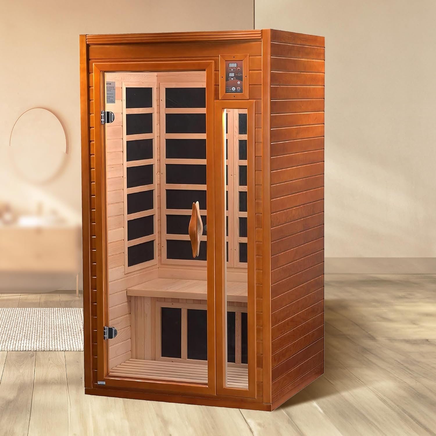Measuring about 39″ W × 36″ D × 73″ H, this sauna fits comfortably in small spaces and plugs into a standard 120-V outlet for simple installation.