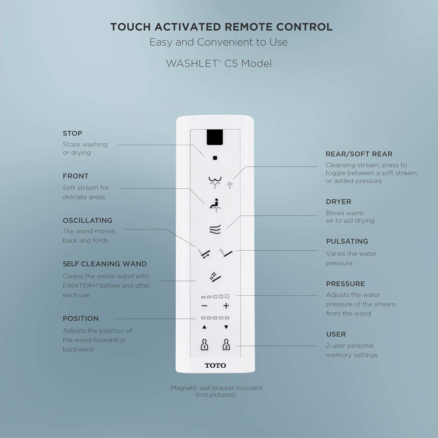 The slim wireless remote features an illuminated touchpad and two-user memory, making it easy to control spray modes, temperature, and drying settings for multiple users.