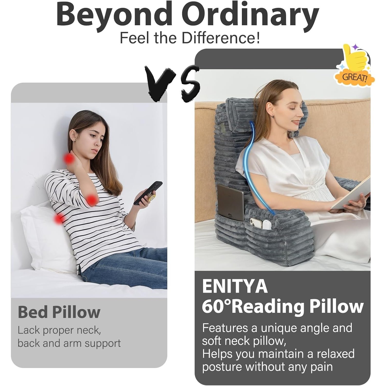 The ENITYA reading pillow provides superior comfort and ergonomic support, ideal for reading, watching TV, gaming, or simply relaxing in bed, on the couch, or the floor.