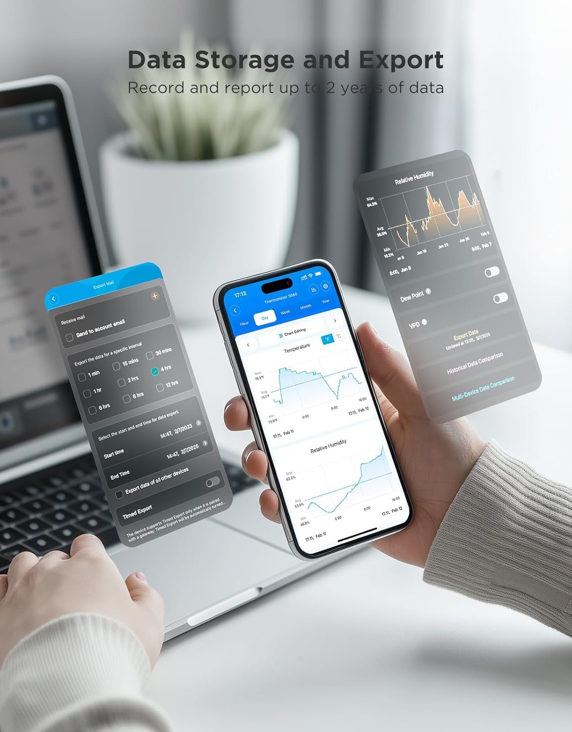 Store and export up to 2 years of temperature and humidity records, allowing you to review trends and optimize environmental control over time.
