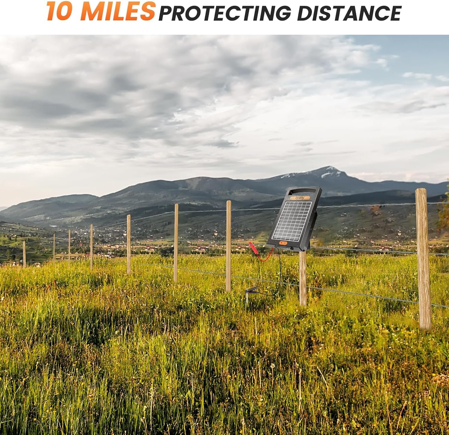 Designed to cover up to 10 miles of fencing, providing up to 10,200 V with 0.18 J energy output for effective predator deterrence.