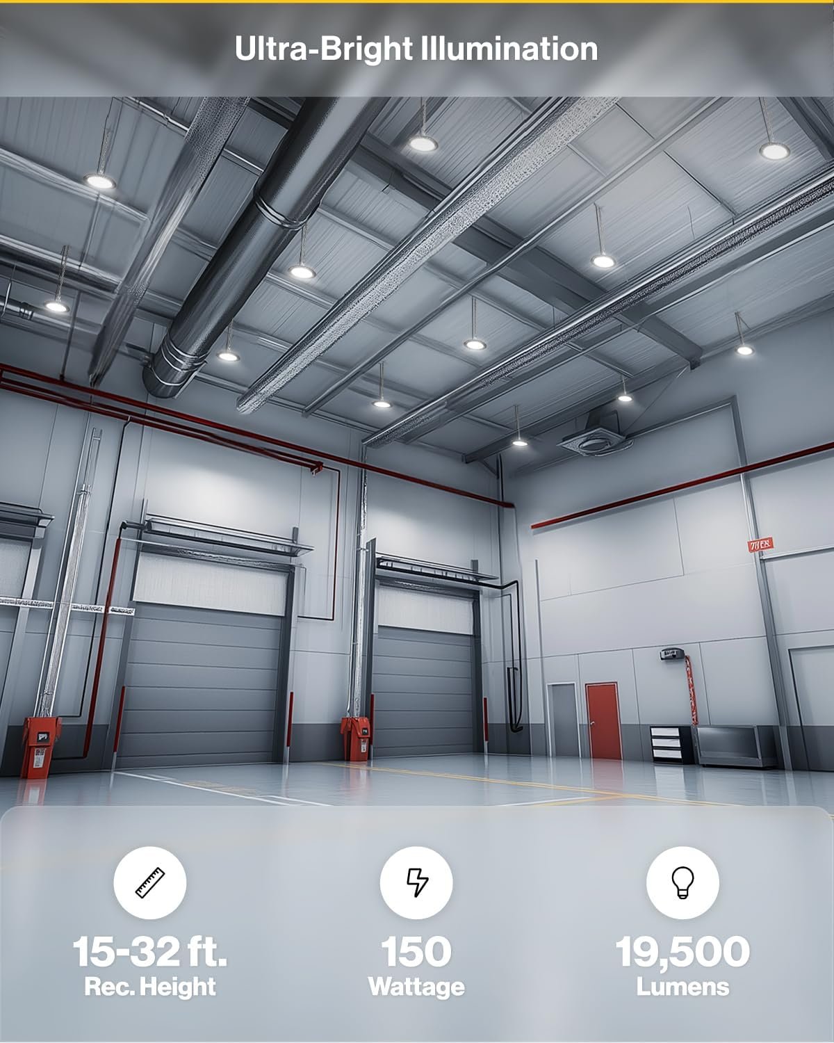 Sunco UFO LED High Bay Light delivers bright 19,500-lumen illumination at 5000K daylight, perfect for warehouses, gyms, and large industrial areas.