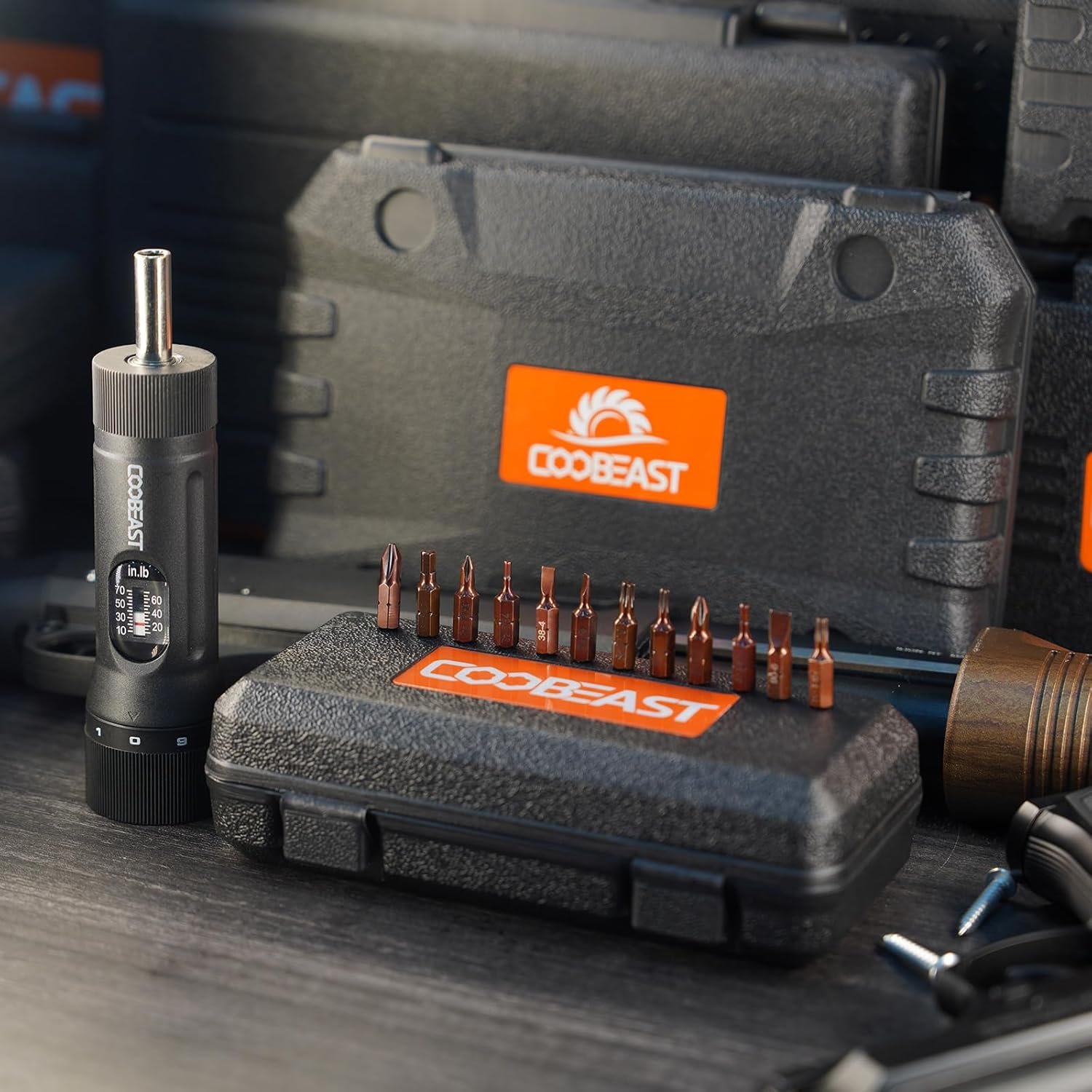Durable Coobeast torque screwdriver set (10–70 in-lb) with 12 S2 bits, ¼″ magnetic holder, and case — perfect for maintenance and mounting tasks.